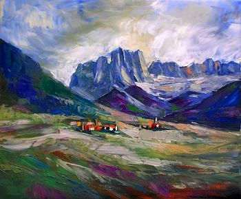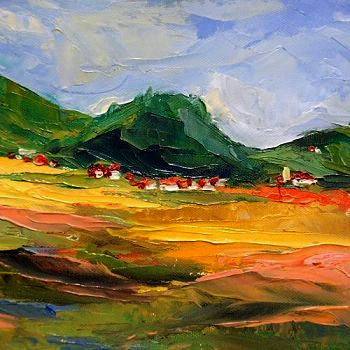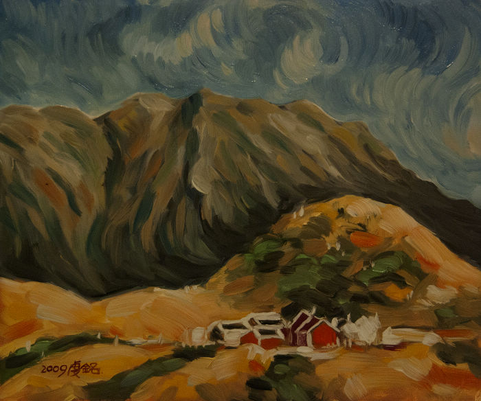 油畫: 山地村落 尺寸: 16x16 cm |  油畫: 高山雲海 尺寸: 8F , 45x38 cm |  油畫: 步道 尺寸: 20F , 72 x 60 cm |